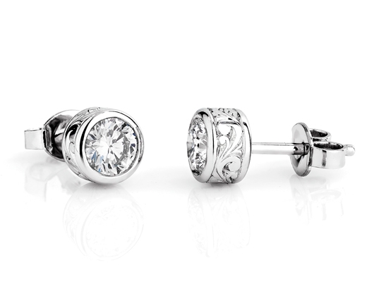 Hand engraved platinum and diamond ear studs