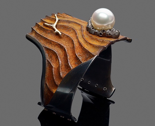 Mild steel, white diamonds, yellow gold and a Cygnet Bay South Sea pearl