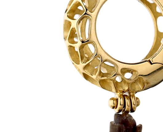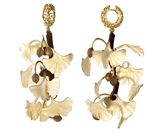 Handcarved, natural ox-horn and 18ct yellow gold drop earrings with shakudo elements