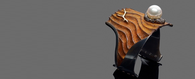 As with all my work, 'Drift' is designed to be handled and appreciated from all angles. It is forged from a plate of mild steel which I carved as ripples in sand then rusted to capture the colour of the Kimberley. The ripples wrap themselves around the pearl, nestled in a cluster of barnacles with diamonds twinkling like droplets of water. A sculpted gold twig rests lightly on the crests of the sand. The scene is framed by softly curling boab leaves in blackened steel, dropping down to more little diamonds on the ends of the cuff - the riveted hull of a pearling lugger or stars in the midnight sky? 'Drift' has the Kimberley Coast in its DNA and is imbued with the spirit of place.
